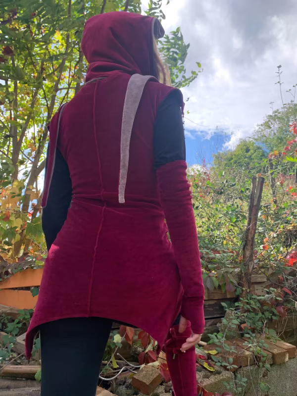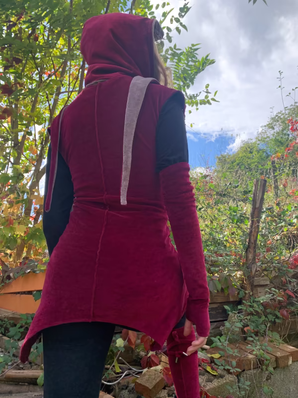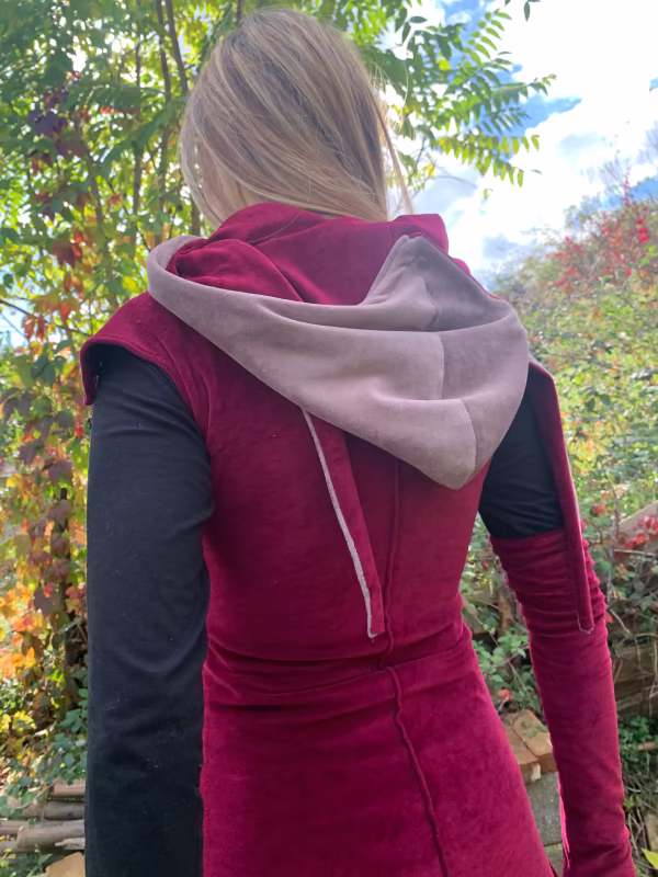 Modulable à souhait, elle se porte en tunique seule pour une silhouette épurée, ou s’enrichit d’une capuche réversible, de guêtres et de mitaines pour un ensemble complet aux allures de création unique. Chaque pièce est cousue main en petite série — jamais plus de 6 exemplaires.